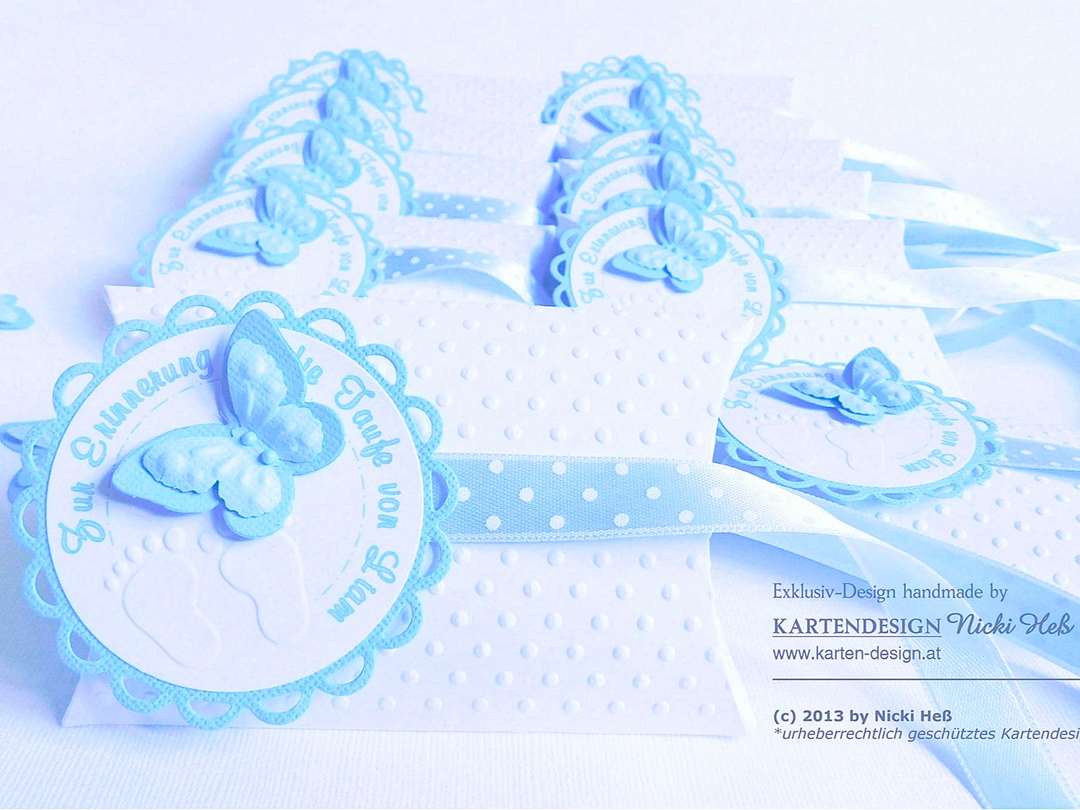 Ein liebevolles Give-Away mit Punkte-Satinband, 3D-Schmetterling & Babyfüßchen. Personalisiert mit Namen, persönlichen Text und wahlweise mit Taufmandeln – ein einzigartiges Dankeschön!