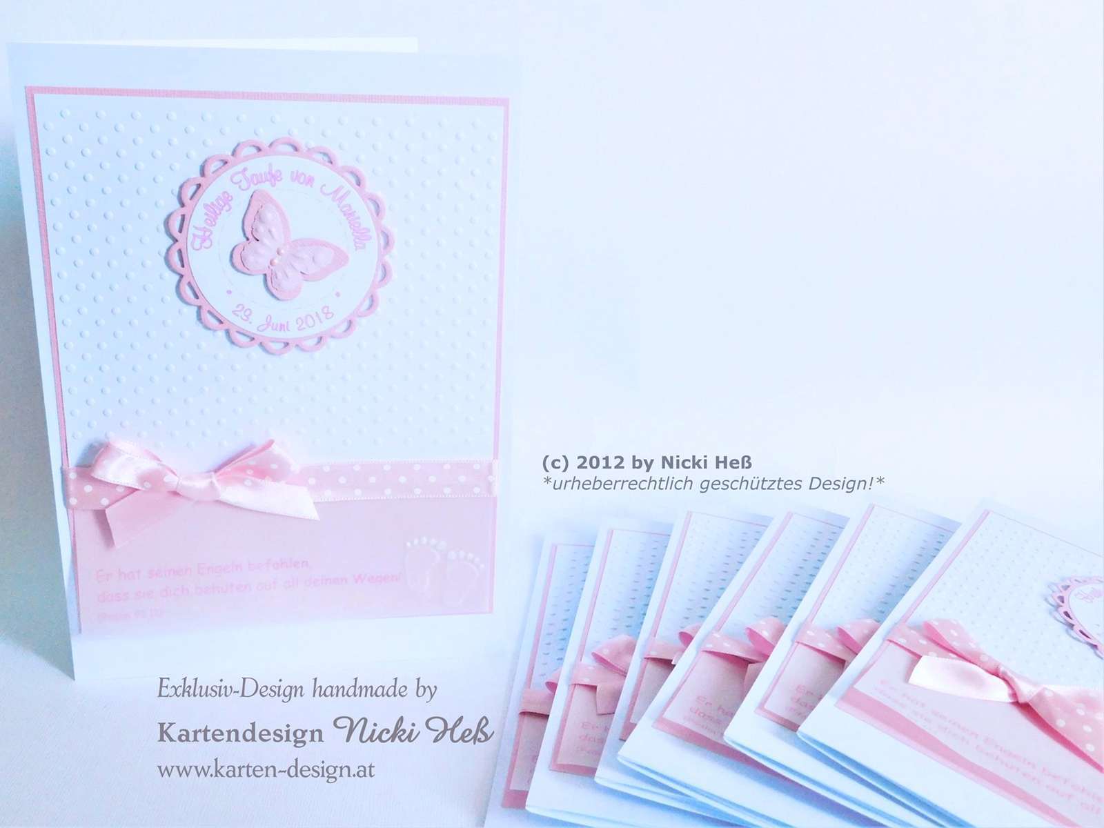 Im unteren Bereich findest du ein bedrucktes Transparentpapier mit deinem individuellen Taufspruch – daneben zieren geprägte Babyfüßchen das Kirchenheft. Das i-Tüpfelchen bildet ein zauberhaftes Pünktchenband in deiner Wunschfarbe das den Taufspruch umrahmt. Eine Komposition aus Stil, Gefühl und liebevoller Handarbeit. 🥰