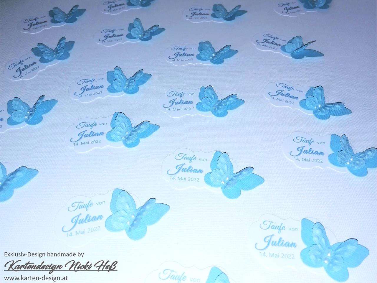 Unter dem Schmetterling befindet sich ein personalisiertes oval geformtes Label (4,7 x 3,0 cm), das mit dem Babynamen und dem Taufdatum (optional) veredelt wird. Dies macht jeden einzelnen Schmetterling zu einem individuellen Erinnerungsstück.